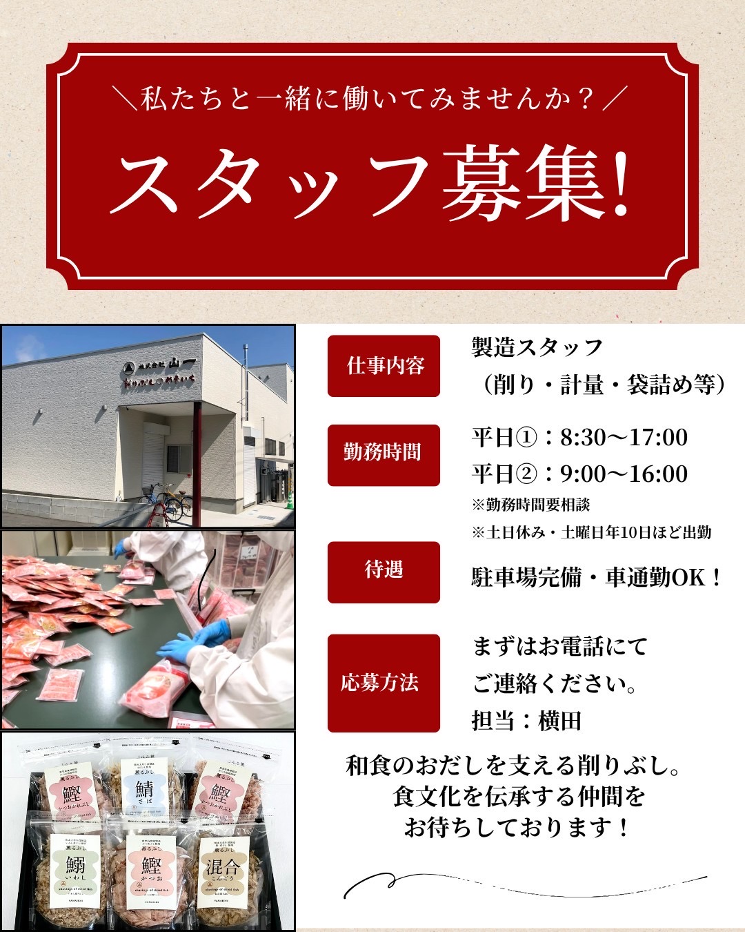 熊本の削り節専門店「やまいち」では、製造スタッフを募集しています✨