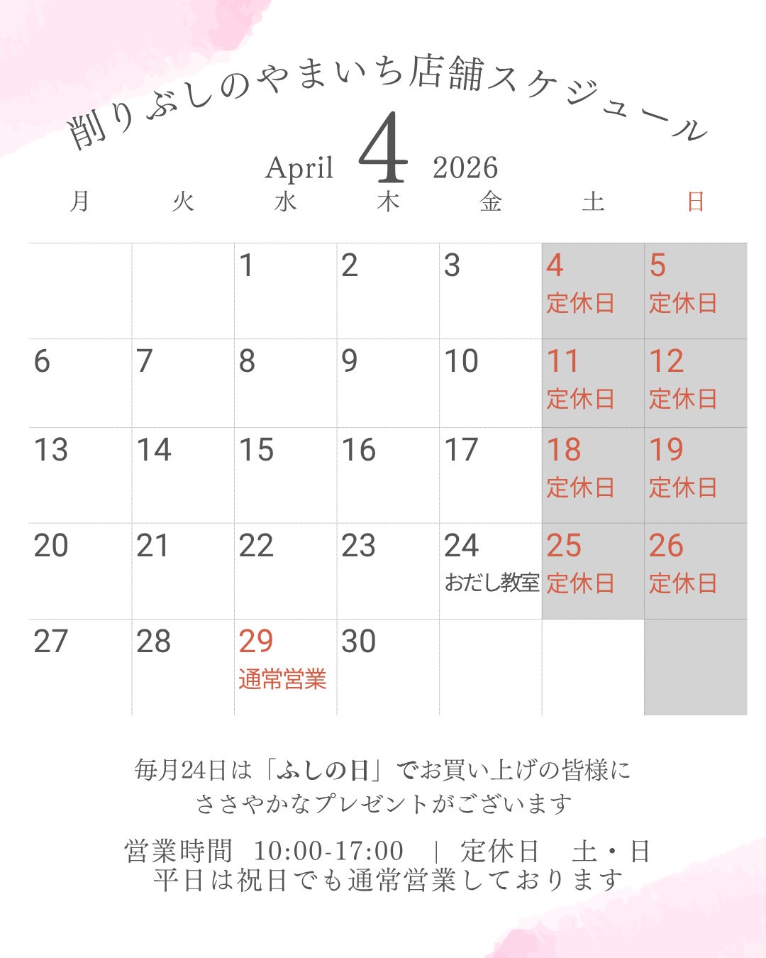 弊社の削りぶしのやまいち店舗 (本店) の 2026 年 4 月の営業カレンダーをご案内いたします。