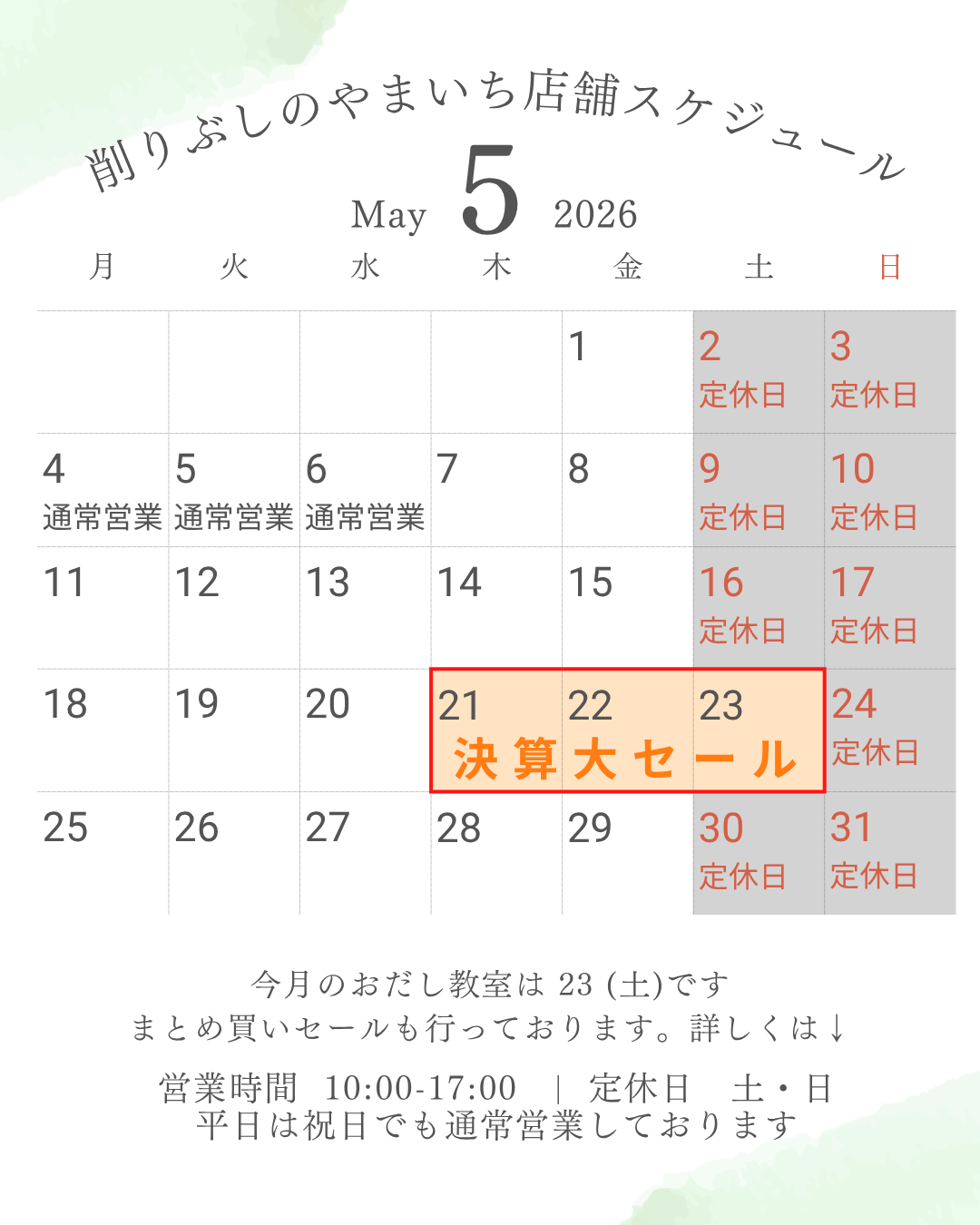 弊社の削りぶしのやまいち店舗 (本店) の 2026 年 5 月の営業カレンダーをご案内いたします。